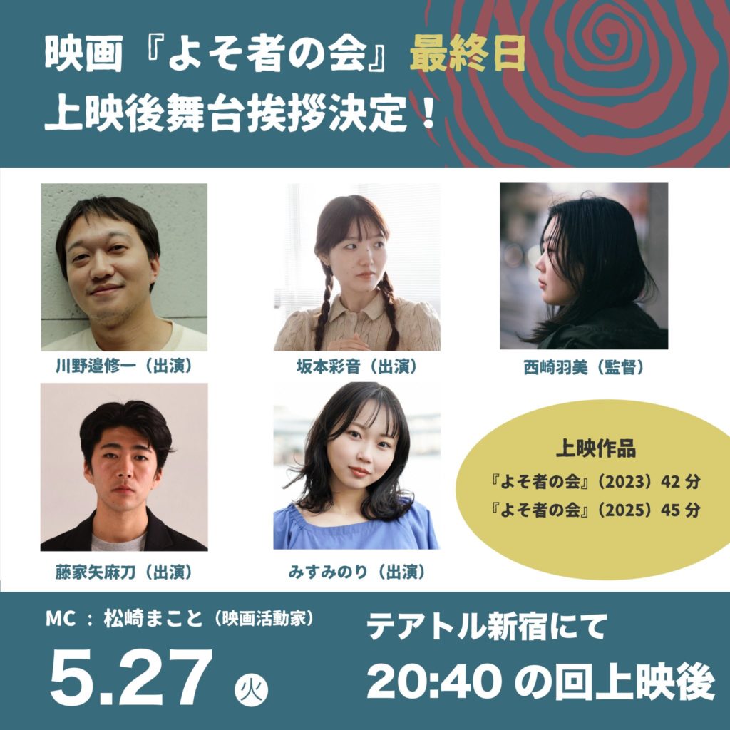「よそ者の会」舞台挨拶【 みす みのり 】 2025年07月02日 2025.05.23 お知らせ出演情報 シェア Tweet 5/27 田辺・弁慶映画祭セレクション2025、テアトル新宿にて「よそ者の会」舞台挨拶に弊社の【 みす みのり 】 山崎 葵 役 が登壇いたします。 是非、ご覧ください。